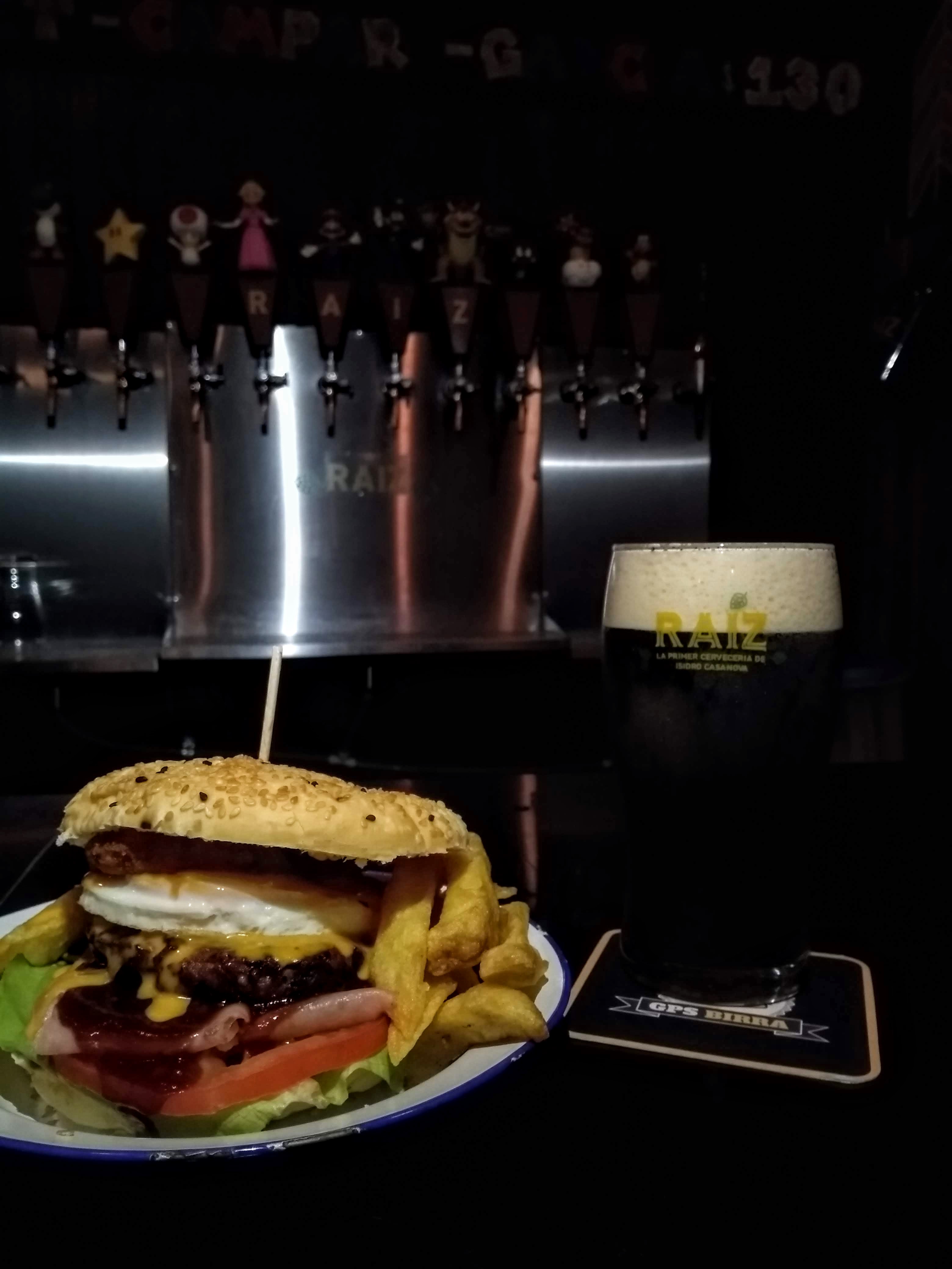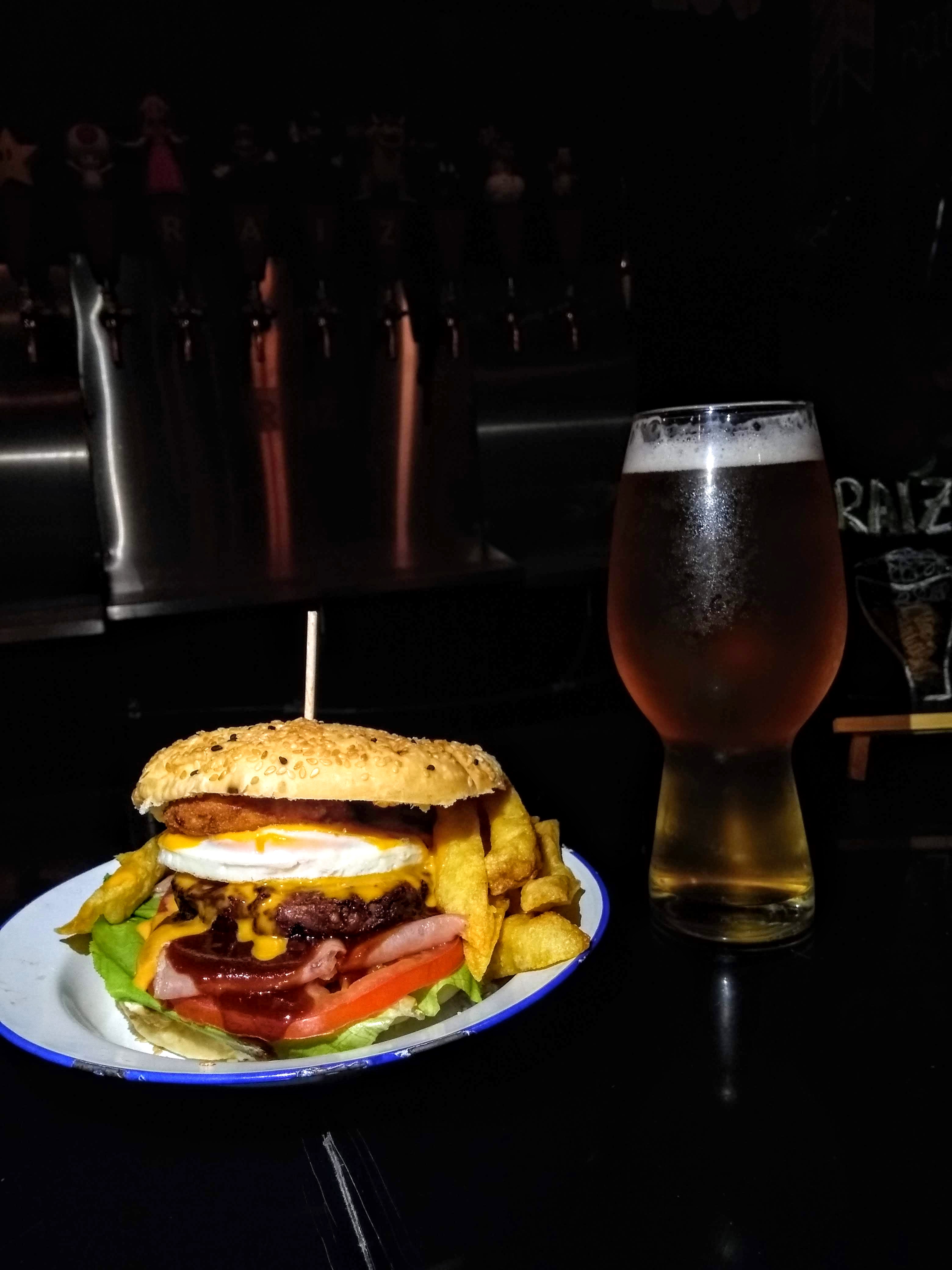 Después, le entramos a una Pizza Caprese (Finita, crocante, con bastante queso y muy rica! Una opción ideal si estás en plan gasolero!) y una Hamburguesa Raíz (Sale con panceta, cheddar, aros de cebolla fritos, lechuga, tomate, huevo y BBQ. Si bien la hamburguesa quizás está demasiado amasada en comparación con las smashed burgers de moda, el sabor general es muy rico! Todos los ingredientes se sienten y se nota que todo es casero y de calidad). Acompañamos con una Nitro Scottish de Beata (Ya saben que es una de las mejores Scottish que hemos probado! Rojiza, con una espuma que es realmente increíble, súper sedosa en cuerpo, con notas a frutos secos y a grano tostado, algunas notas licorosas, de bajo amargor y muchísima tomabilidad) y una American IPA de Beata (dorada, en aroma y boca las notas cítricas resaltan y hacen una birra súper fresca, de amargor medio y mucha tomabilidad) .