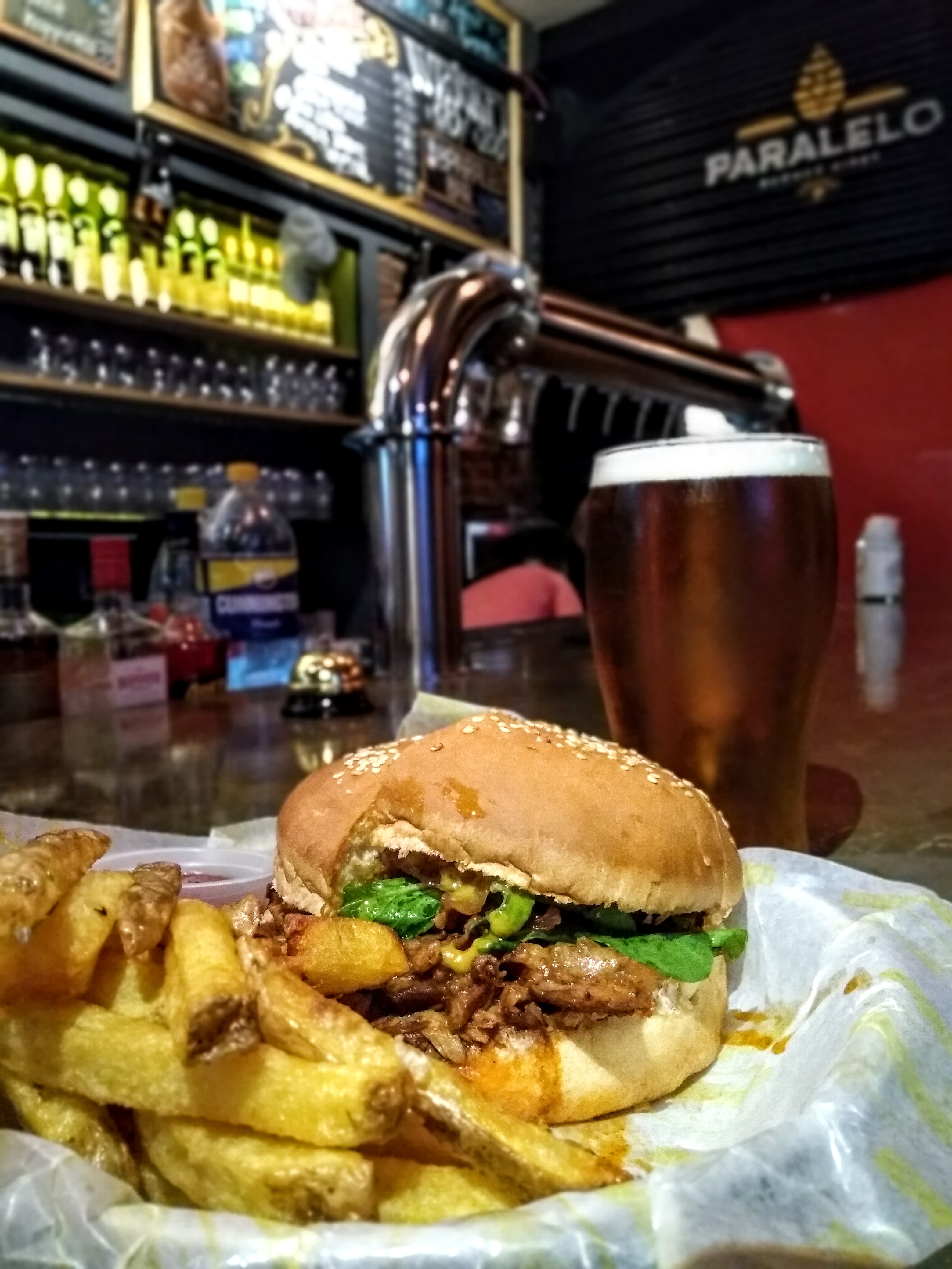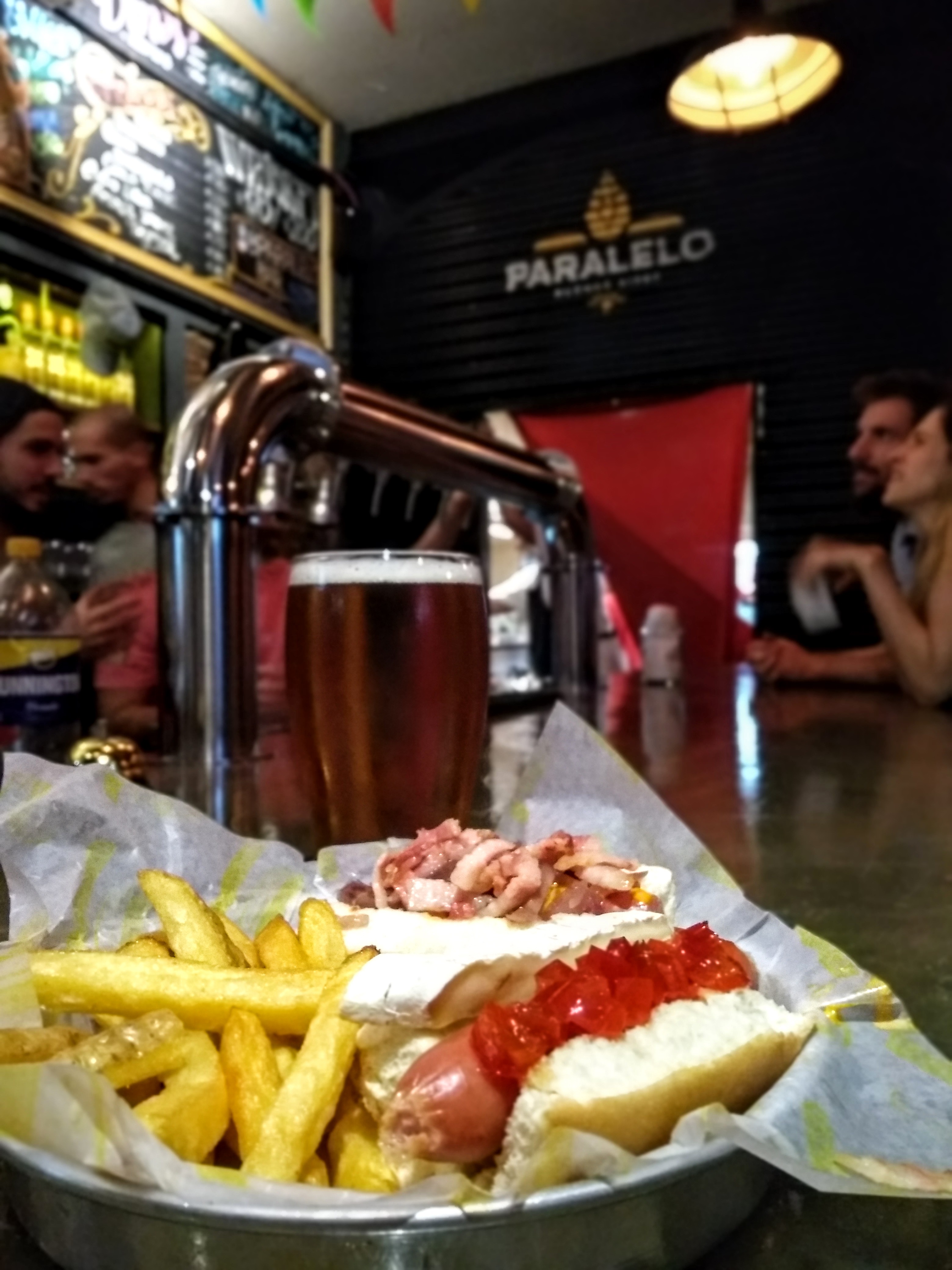 Después, le entramos a un Sandwich de Bondiola (sale con rúcula, mostaza y cebolla caramelizada y es una locura! Súper sabroso, jugoso y dulzón. Por algo es la estrella de la casa!) y un Pancho mitad queso brie y mermelada de morrón (un despelote. Lo ahumado de la salchicha, junto a lo cremoso del brie y lo dulce de la mermelada de morrón hicieron que lo amemos fuertísimo!) y mitad cheddar, panceta y cebolla caramelizada (ingredientes clásicos, pero gran sabor! Locura). Mención aparte para las papas que acompañan, la rompen! Aplausos de pie para toda la fritura de Paralelo! Tomamos la American IPA de Minga (dorada intensa, con notas a frutos tropicales en aroma y boca, y alguna nota cítrica que se cuela. Una de nuestras American IPA preferidas!) y una Mango Milkshake IPA de Okcidenta (amarilla pajiza, bien turbia, súper frutada en aroma y boca -predomina el mango pero aparecen otras frutas tropicales como el maracuyá que le da un toque más cítrico-, súper sedosa).