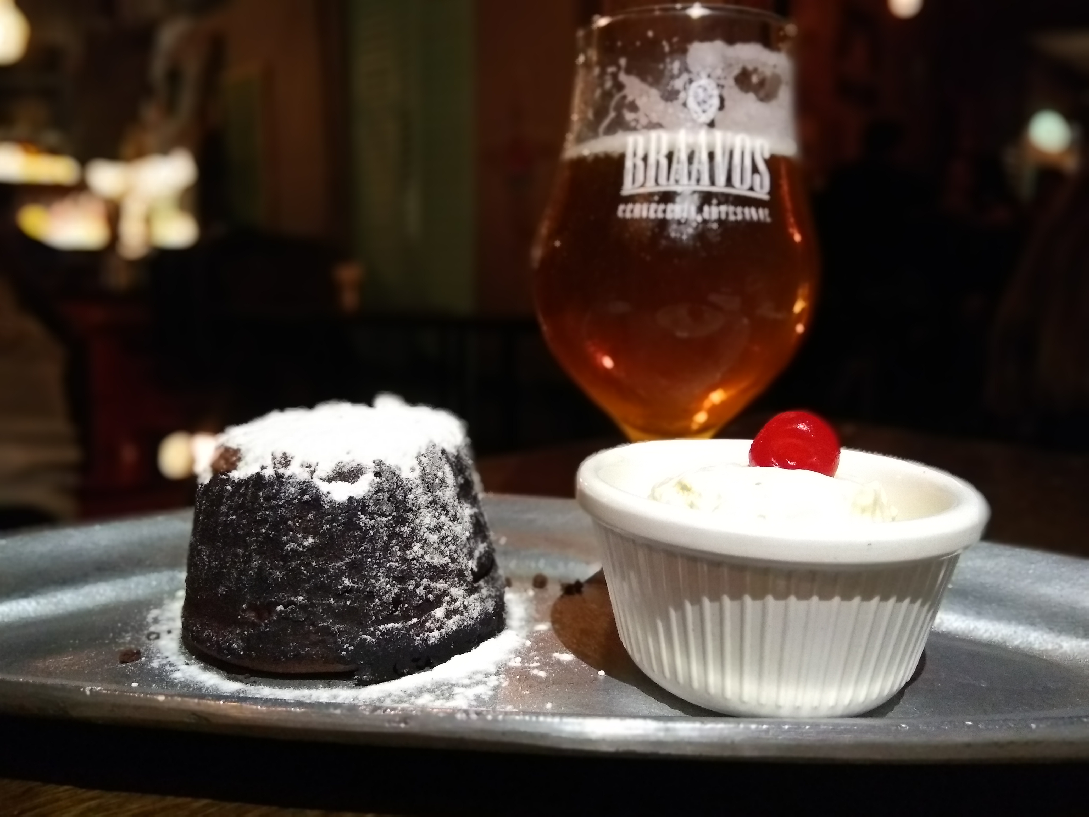 Intentamos cerrar la noche con una American IPA de Finn (dorada, cítrica en aroma, en boca aparecen notas a frutos tropicales, de bajo amargor y muchísima tomabilidad! Nos gustó muchísimo!) y una American Amber Ale de Cheverry (rojiza, con notas a frutos secos y de carozo, caramelo tosado, liviana en cuerpo pero con capas de sabores, una birra que no falla!). Pero el moño de la visita fueron el Volcán de chocolate y el trago que nos tomamos en la barra del patio! El volcán de-li-cio-so, una bomba chocolatosa que es una locura! Y el trago, qué decirles? Nos pedimos un Afrodita, que viene con gin, jugo de pomelo, lima y frutilla, y nuestra recomendación es que lo prueben! Porque es un camino de ida!
