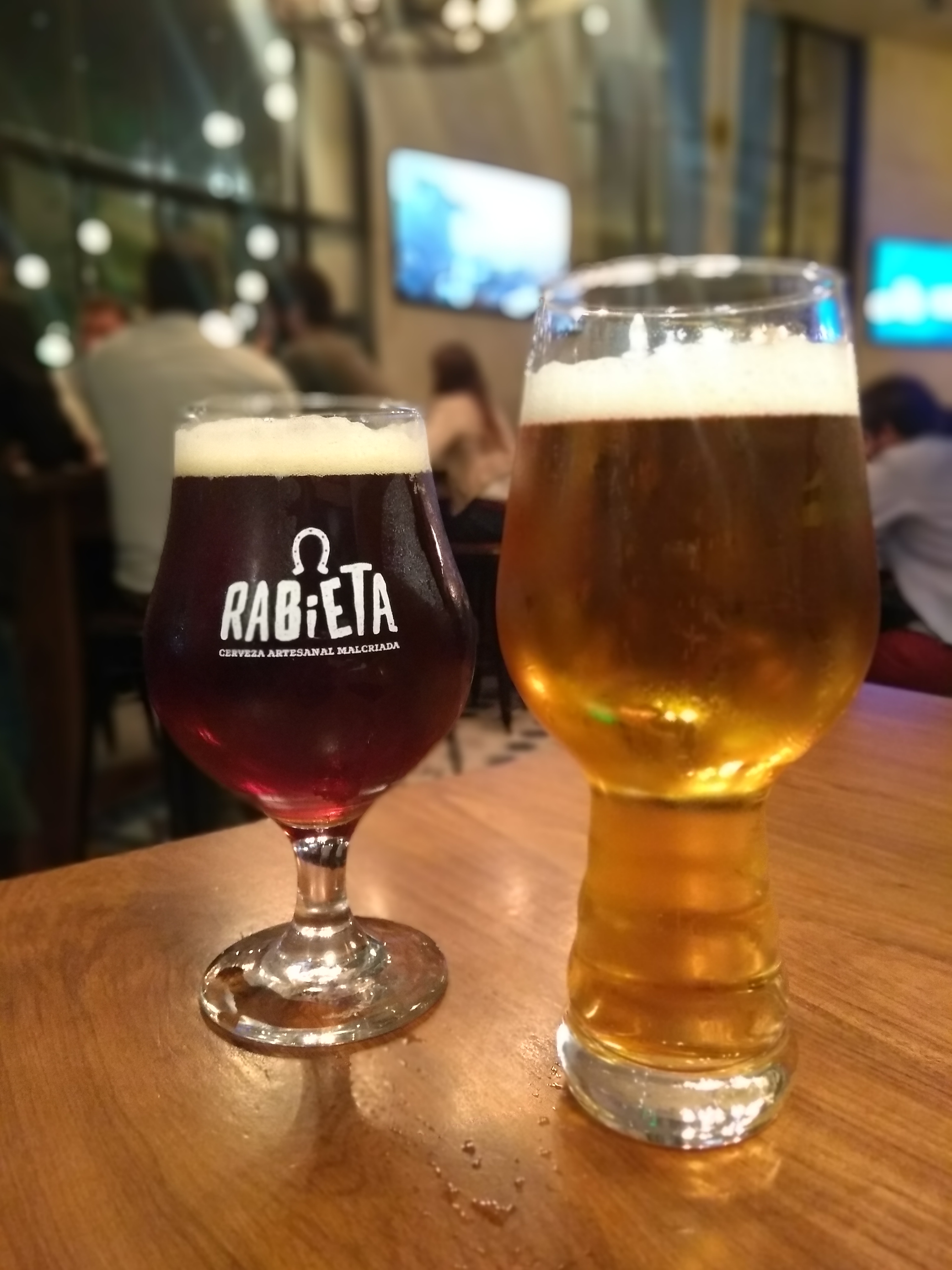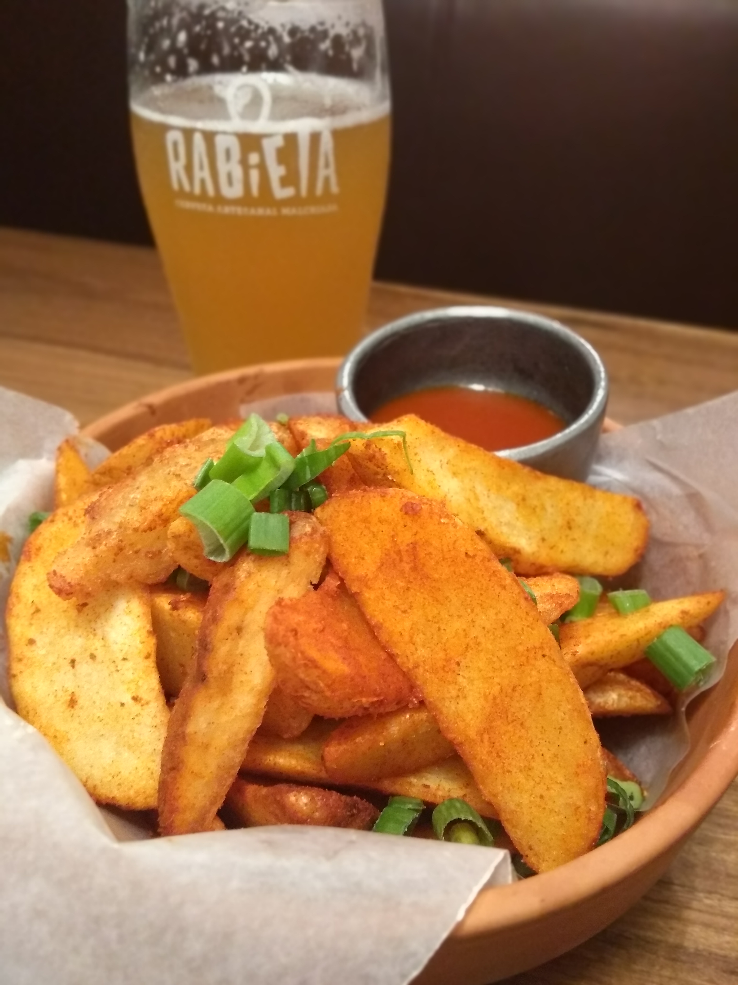 Nosotros arrancamos con unas Papas Bravas (salen en cazuela de barro, cortadas en cuña, espolvoreadas con pimentón y son la gloria! Vienen con la salsa picante aparte, ojo porque es un fuego!) y una Pizza Fugazzeta Rabieta (Viene con provolone, queso azul, nueces y cebolla caramelizada. Una delicia que hace que te exploten los diferentes sabores en la boca! Nos encantó!). Acompañamos con una Irish Red Ale de Rabieta (roja intensa, de espuma color té con leche bien cremosa, aroma a caramelo tostado que se repite en boca y da lugar a un dulzor muy rico! Una birra suave y de mucha tomabilidad), una Citra IPA de Rabieta (dorada intensa, con algunos destellos anaranjados, con aromas marcadamente cítricos, y un buen balance de maltas en boca. Fácil de tomar y súper fresca!) y una Helles de Rabieta (dorada intensa, es un estilo que nos cuesta describir porque lo que nos sale es una sola palabra: praderas. Con notas a grano en boca, algunas notas florales y suavemente frutadas, es una birra suave, de final seco).