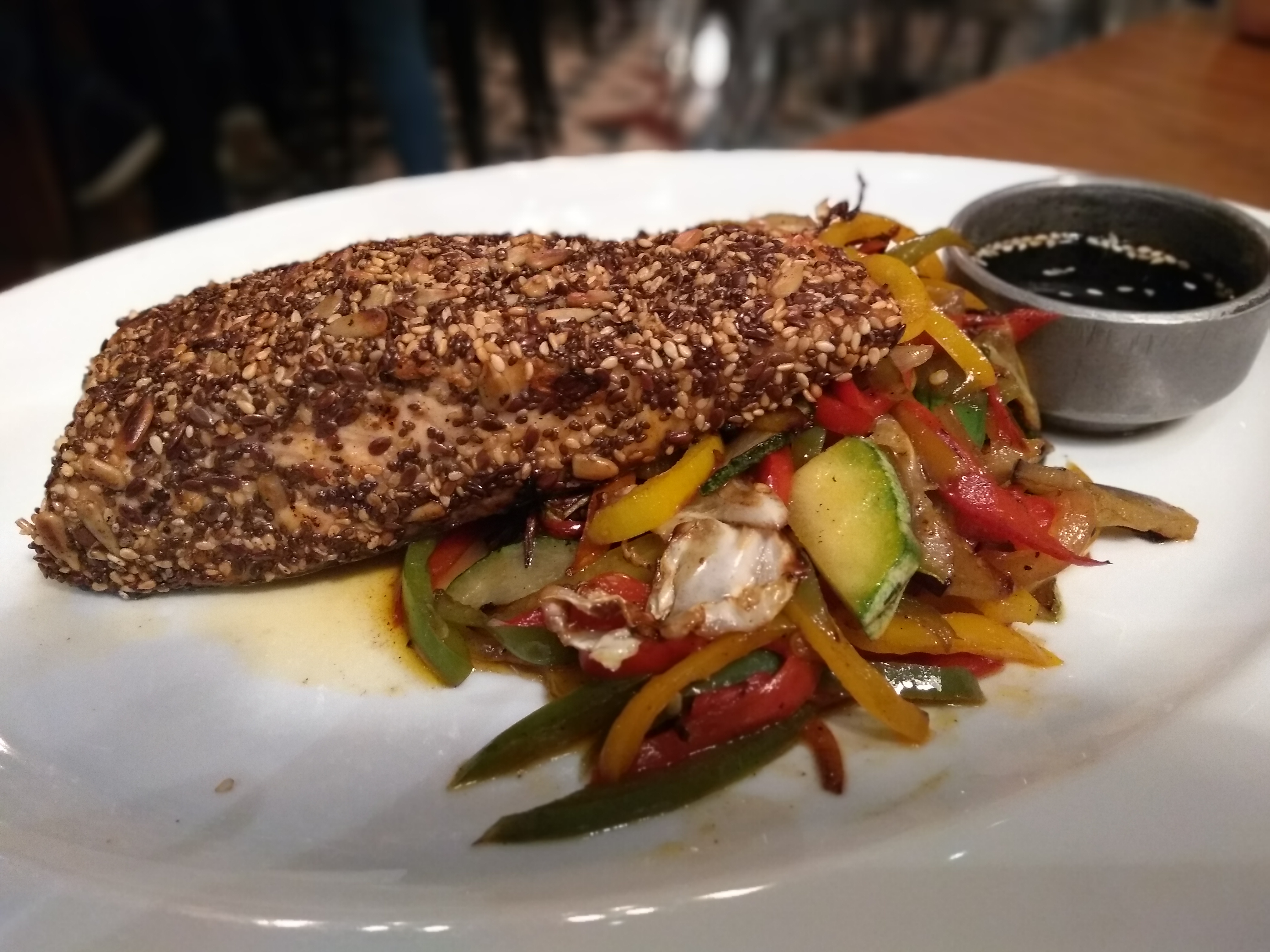 Como si no fuera suficiente con todo lo que les contamos, también nos dimos la chance de probar los «platos principales» de Rabieta, y elegimos una Burger París (con mayonesa de albahaca, tomate asado, huevo frito, queso raclette y albahaca en pan brioche. Una locura! Los sabores se amalgaman y la burger se te deshace en la boca. El medallón de carne es súper sabroso y el pan bien esponjoso!) y el Salmón Rosado (sale «envuelto» en semillas -en la carta dice «en costra»- y viene acompañado de vegetales grillados, salsa teriyaki y timbal de arroz. Un plato de calidad de restaurante en una cervecería, riquísimo es poco!). Nos dimos el gusto también de probar los creppes de jamón y queso sin T.A.C.C (a no desesperar con la contaminación cruzada, celíac@s! Lo sirvieron fuera de su packaging original para que saliera lindo en la foto!): nos sorprendió lo ricos que estaban! Esperábamos algo desabrido y nos encontramos con un gran plato, rico y abundante! Tomamos una Brut IPA de Rabieta (dorada, con aroma a frutos tropicales y leves notas cítricas, de tomabilidad peligrosa y cero amargor. Hermosa birra!) y una Wee Heavy de Rabieta (roja intensa, con algunos tintes bordó y amarronados, de aroma especiado, en boca aparecen notas a ciruelas, frutos secos, caramelo tostado, jerez. Una birra intensa en alcohol para disfrutar sorbo a sorbo!).
