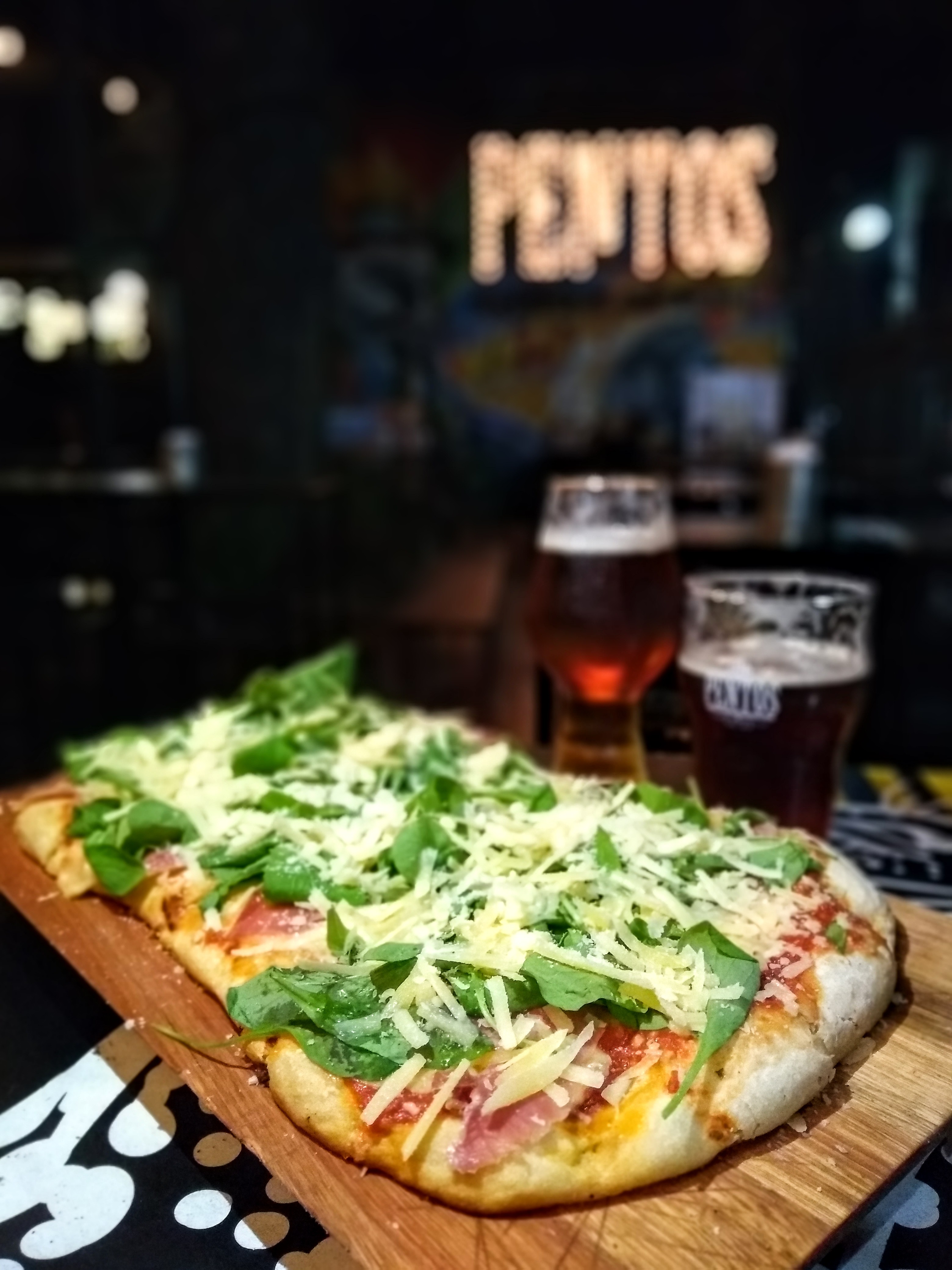 Seguimos con una Pizza de Jamón crudo y rúcula (sale bien cargada de ingredientes, y es una buena opción para compartir si están en plan gasolero! A nosotros la masa nos gusta un poco más crocante, pero es algo que no aclaramos antes de hacer el pedido) y una Hamburguesa Triple Pentos (triple carne con cheddar, panceta, rúcula, cebolla caramelizada y pepinillos. Una bomba deliciosa! Súper sabrosa, con un blend de carne muy rico y gusto a parrilla. Los ingredientes se sienten todos, y van formando capas de sabores en tu boca. Nos gustó muchísimo!). Acompañamos con una Hoppy Blonde de Bauer (dorada, con buen soporte de granos en boca, de final terroso. Muy buena!), una American IPA de Cartago (color ámbar, de aroma floral, en boca notas florales y frutales que aportan cierto dulzor para luego dar lugar a un amargor moderado), una APA de Corvo (dorada, con notas herbales y terrosas en boca que dan lugar a un amargor medio-alto y final seco. Quizás nos hubiera gustado que tenga un poco más de aroma por el estilo) y una Australian Amber Ale de Paso Morales (rojiza, de espuma persistente, la malta caramelo estaba bien presente en aroma y boca, y al final aparecen notas terrosas).