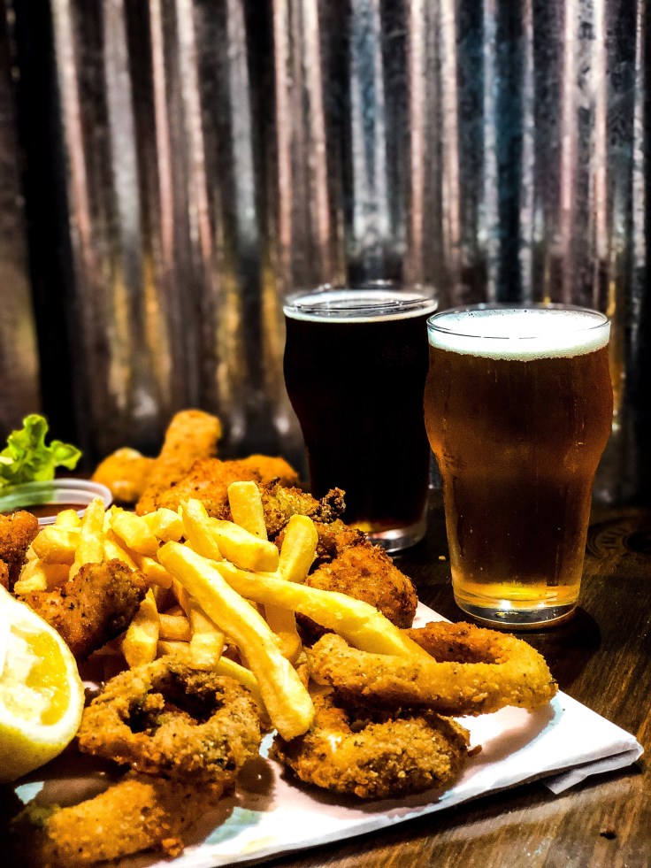 La picada caliente tiene pescado, papas, aros de cebolla, mozzarella y pollo. Todos empanados y fritos. Siendo las papas y los fritos el plato por excelencia de las cervecerías hay que saber que no todas las birras maridan con ellas. Las cervezas lupuladas y cítricas por lo general son las que mejor los acompañan. Esta vez elegimos una APA de Mur, que realzaba los sabores tanto de la comida como de la cerveza. El amargor de la birra limpia un poco lo grasoso de la comida dejando lugar para que resalten los sabores propios del pescado, del pollo, de la cebolla y de la mozzarella. En el caso de la cerveza se destacan más las notas cítricas aportada por los lúpulos.