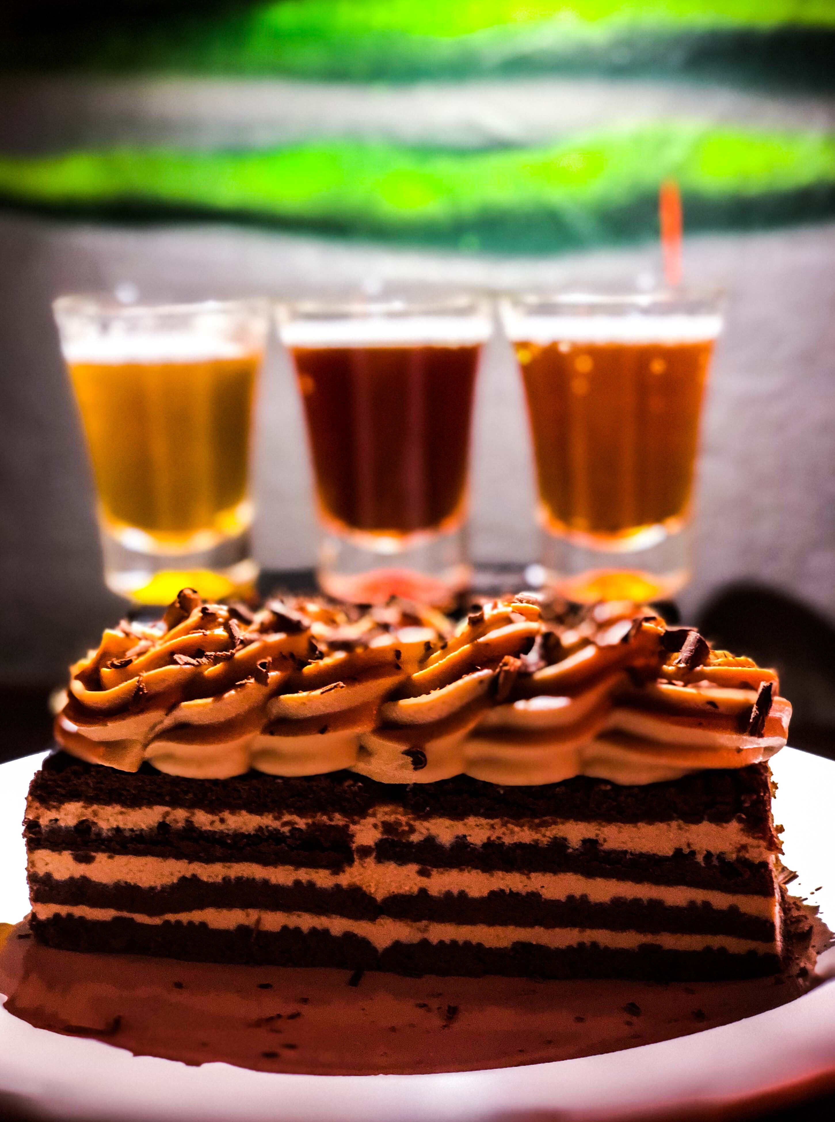 Para cerrar la noche, el postre elegido por nuestro anfitrión Julián fue la Chocotorta. Como ya a esta altura sabemos, con una porter o una stout marida bien por aportarle un poco más de sabor a café y cortar un poco el dulzor del postre. Esta vez seguimos jugando con Pachu y pedimos tres chupitos con distintos estilos. Una honey y una Irish Red Ale de Tacuara y una Barley Wine de Antares. Excepto la IRA que peleaba en el dulzón y hacía desaparecer el dulce de leche, las otras dos maridaban muy bien. La Honey le aportaba un dulce mas particular y una humectación a la torta. La Barley Wine, realzaba tanto la chocotorta como los frutos rojos (uva, ciruleas) de la cerveza resultando en el mejor maridaje de la noche.