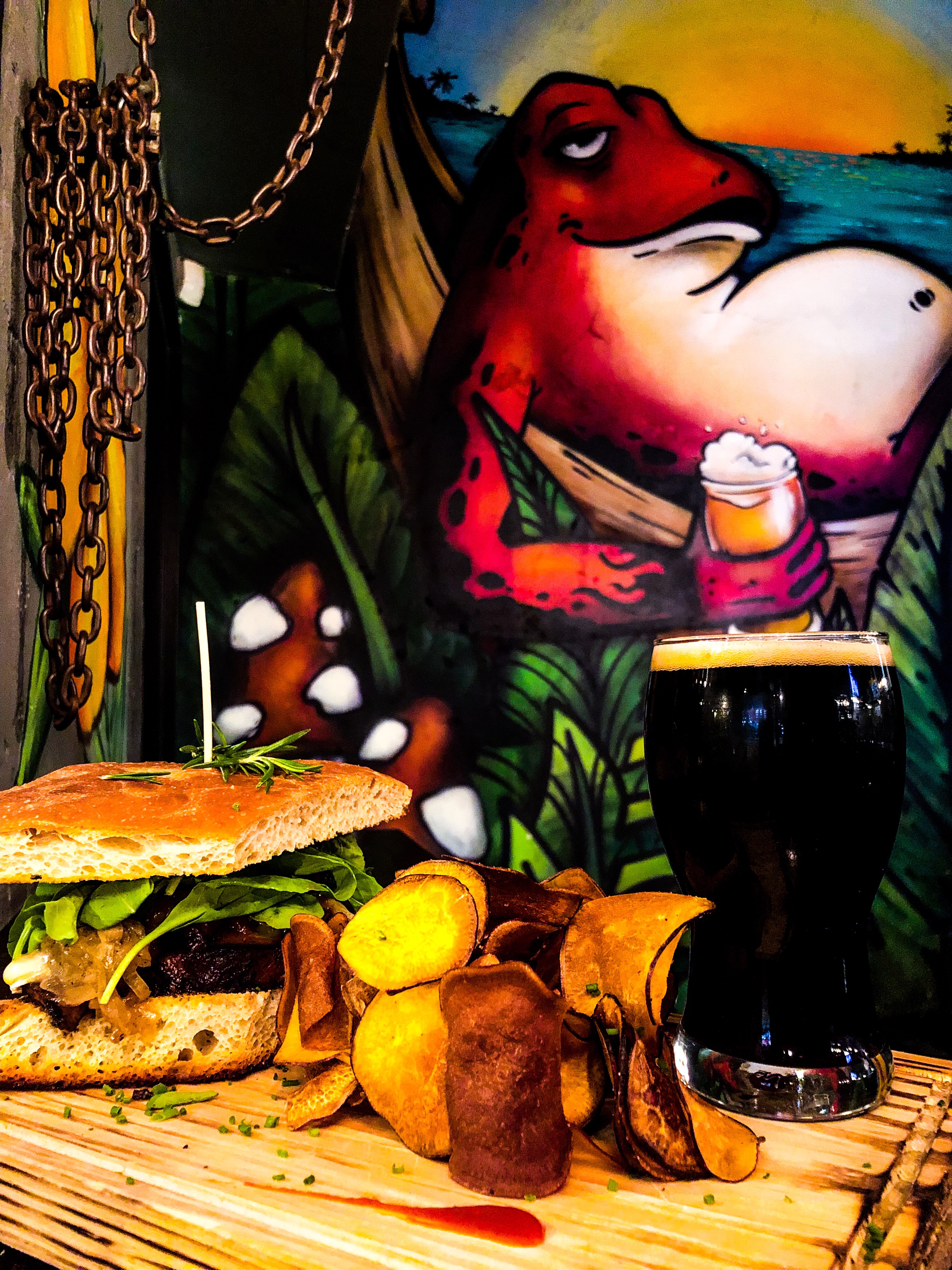 El plato principal, y cuando vayan y lo prueben entenderán porqué es la figurita recomendada de Red Frog, fue la Bondio Braseada. Pan ciabatta hecho en su propia cocina, bondiola de cerdo, cebolla caramelizada, tomate confitado, rúcula, queso brie, mostaza dulce y una sevilleta para limpiarte la baba. La recomendación del menú aconsejaba pedirla con una cerveza negra. Si nos guiábamos con la sesión de maridaje I, hubiésemos elegido la Robust Porter de Darwin. Pero no, seguimos jugando y pedimos una negra pero ligera. Pedimos la Jim Morrison de Tacuara. Una black honey con whisky con bajo aroma a café, aunque muy presente en boca que junto al whisky le daba un perfil de Tía María (licor de café). En el maridaje, la cerveza quedó muy por debajo, ya que al no tener tanto cuerpo (cremosidad) el plato le compite con muchos sabores. Lo bueno es que limpiaba el paladar, invitando a comer rápidamente otro bocado de la belleza braseada. Eso también es un buen maridaje. Por separados no compiten ni dan sabores feos y uno cumple la función de potenciar al otro. En este caso, la cerveza limpia el paladar pudiendo encontrar nuevos sabores en el próximo bocado.