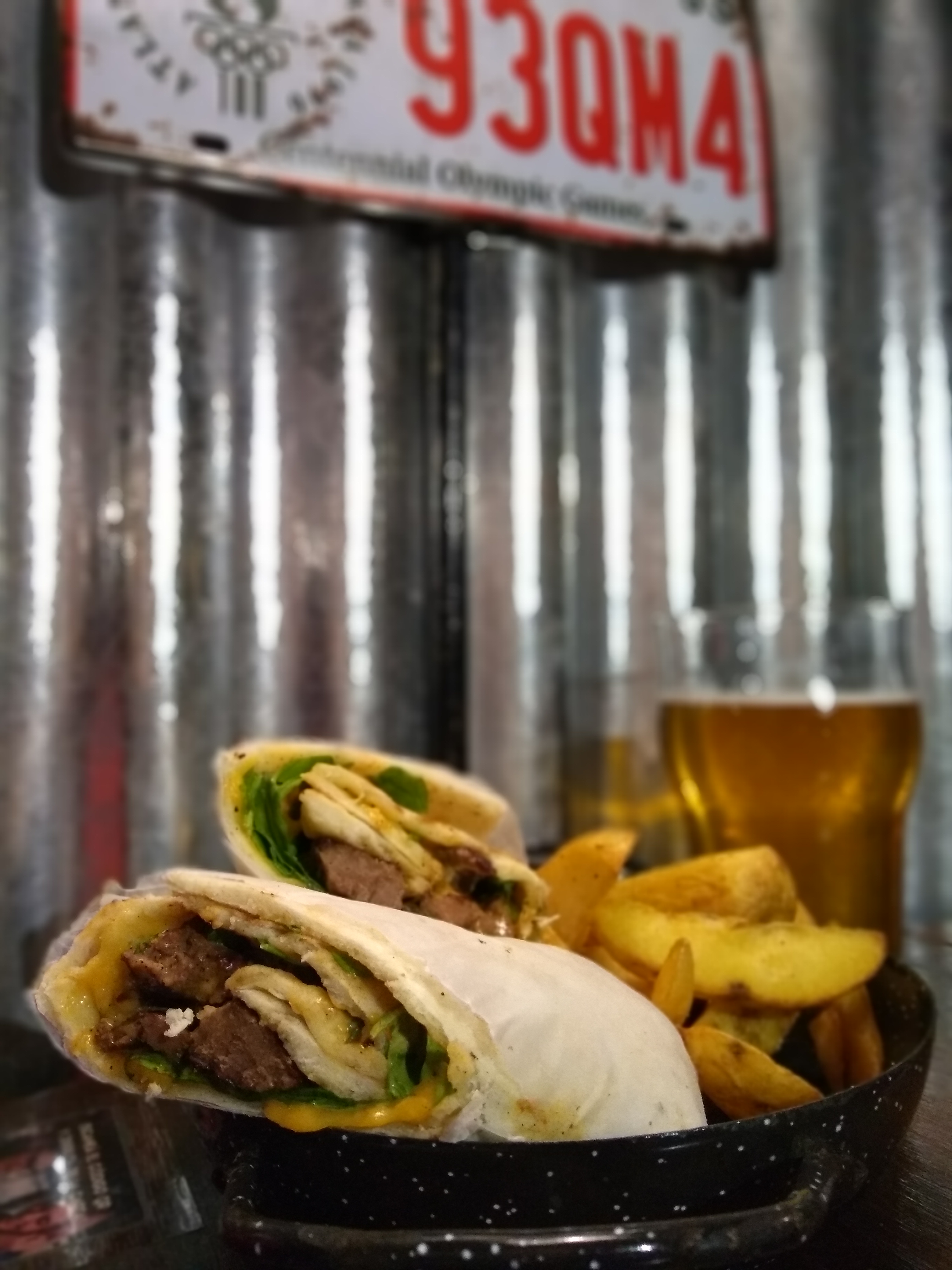 Después, le entramos a un Chori El Taller (chori con cebolla caramelizada, rúcula, tomates secos -que ese día no había así que salió con tomates frescos- y salsa criolla. El pan es una locura, el chori no te mata, el toque dulce de la cebolla caramelizada le da un sabor súper rico! Nos gustó mucho!) y un Wrap de carne (con cebolla caramelizada, rúcula, salsa de la casa y cheddar. La tortilla es bien casera, y el relleno riquísimo! Una gran opción para los que quieren comer un poco más liviano! Sale con papas cuña, que nos gustaron mucho más que las bastón!). Tomamos una NEIPA de Darwin (dorada, balanceada entre frutos tropicales y cítricos, de bajo amargor y mucha tomabilidad. Le faltó quizás la turbidez, cuerpo y sedosidad que caracterizan a las NEIPAs).