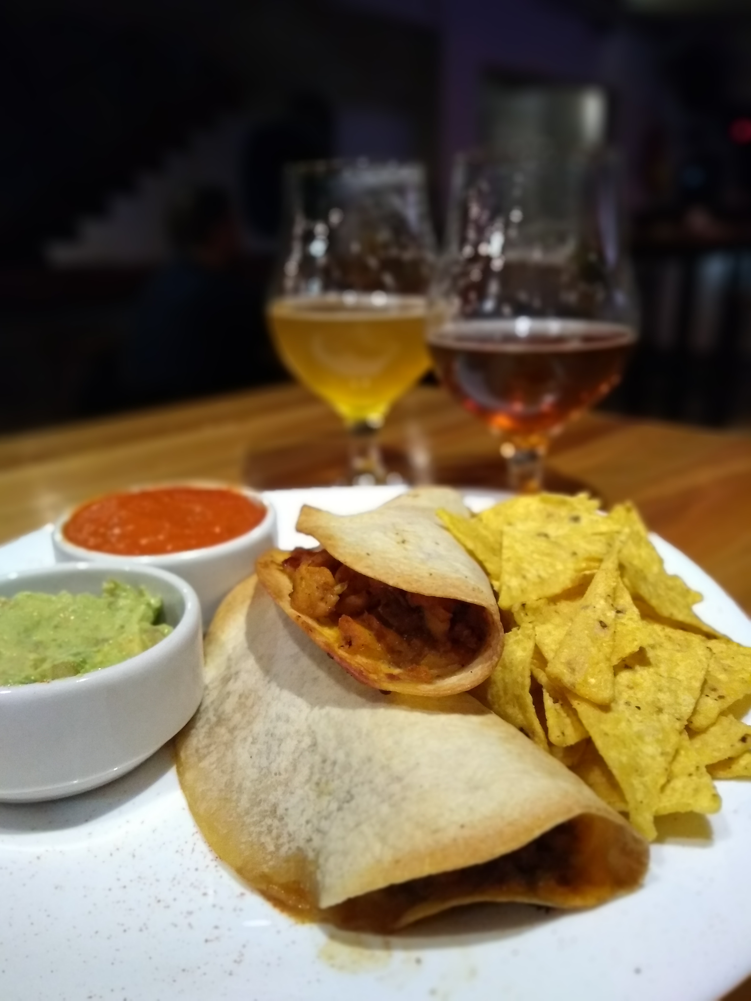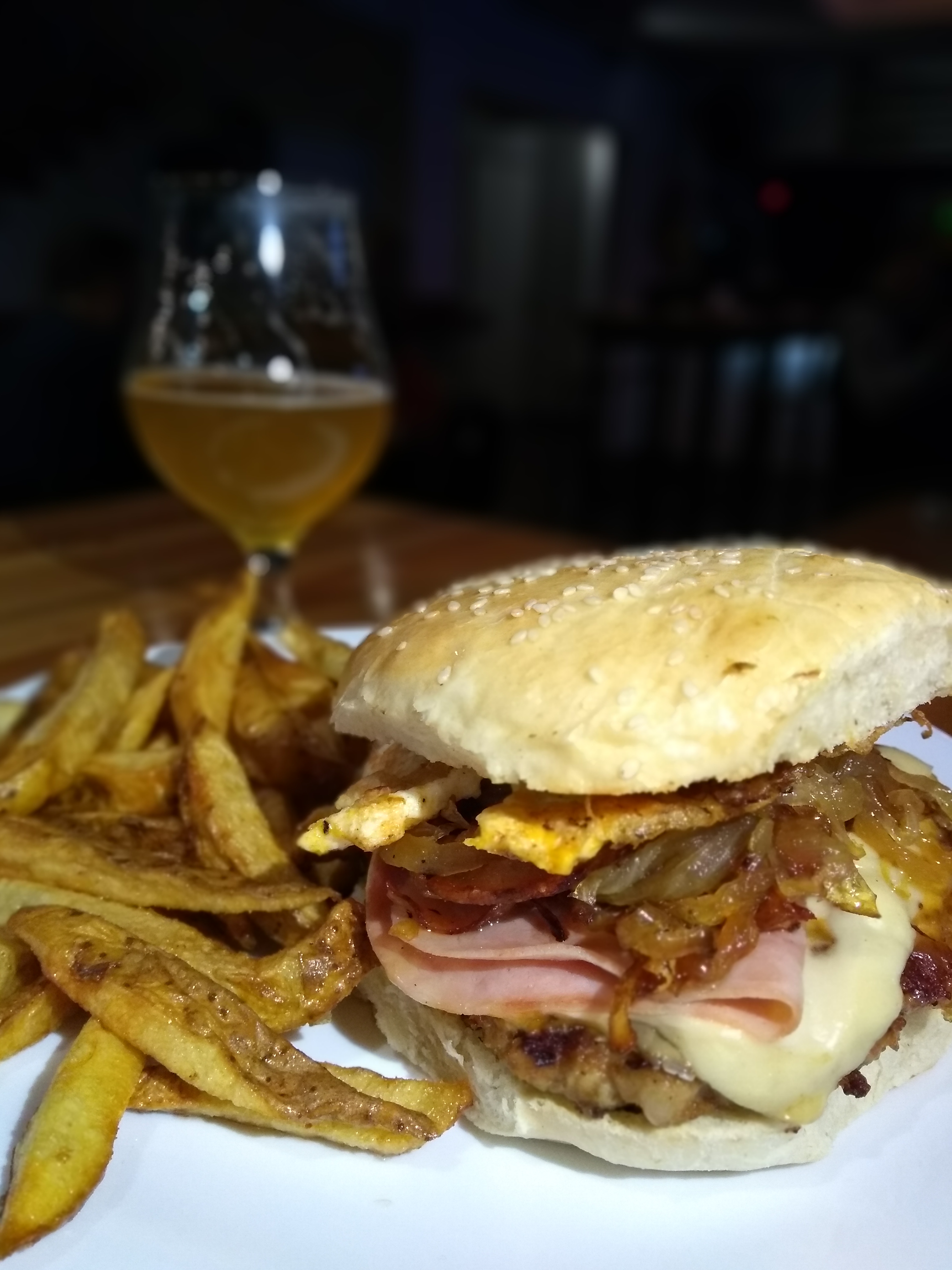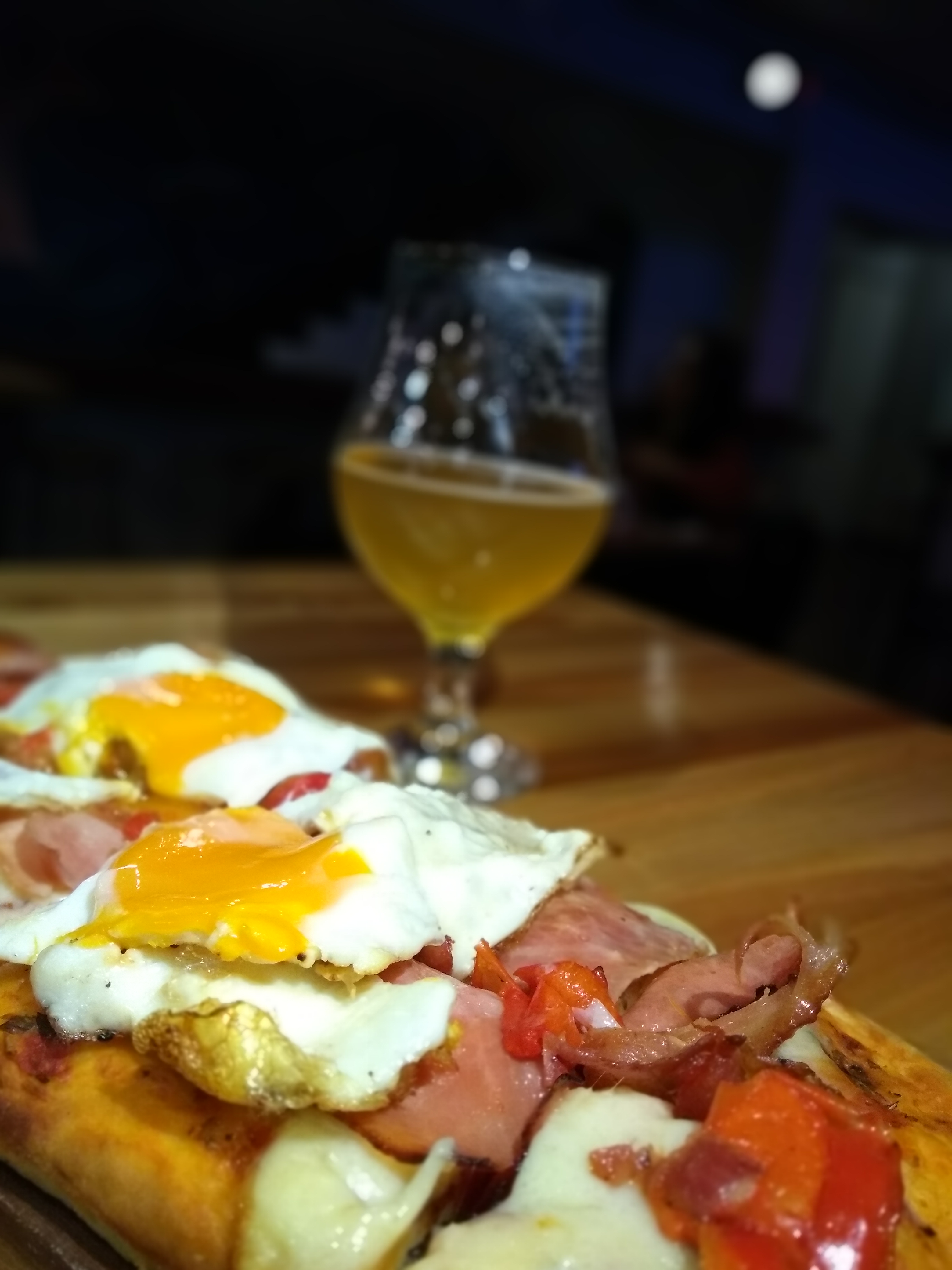 Seguimos con una Hamburguesa Gran Ortiz (sale con jamón, queso cheddar, huevo, panceta y cebolla caramelizada. Aunque el medallón es «vieja escuela» -está condimentado-, es una rica burger que cumple muy bien! Sale con papas con cáscara!), una Pizza Gran Ortiz (muzzarella, jamón, morrones, panceta y huevo frito. Casera y súper rica, una bomba!) y los Tacos (sale uno de pollo y otro de carne, ambos son súper sabrosos y están muy bien condimentados! Vienen con guacamole y salsa de tomate). Tomamos una Scottish de Baum (rojiza, de espuma poco persistente, con notas a caramelo, nuez, ciruela, una birra clásica y dulzona), una Pale Ale de Mur (amarillo pajizo, de espuma bien blanca, en aroma aparecen frutos tropicales y cítricos que se repiten en boca en una birra con mucha tomabilidad, buen cuerpo y cero amargor), una Golden de Coleman (dorada, bien maltosa, con buen soporte de granos. Fácil de tomar y de final seco, muy buena Golden!) y una Porter Bourbon Vainilla de Broers (negra intensa, con notas a café, chocolate y se nota sobre el final la nota alcohólica).