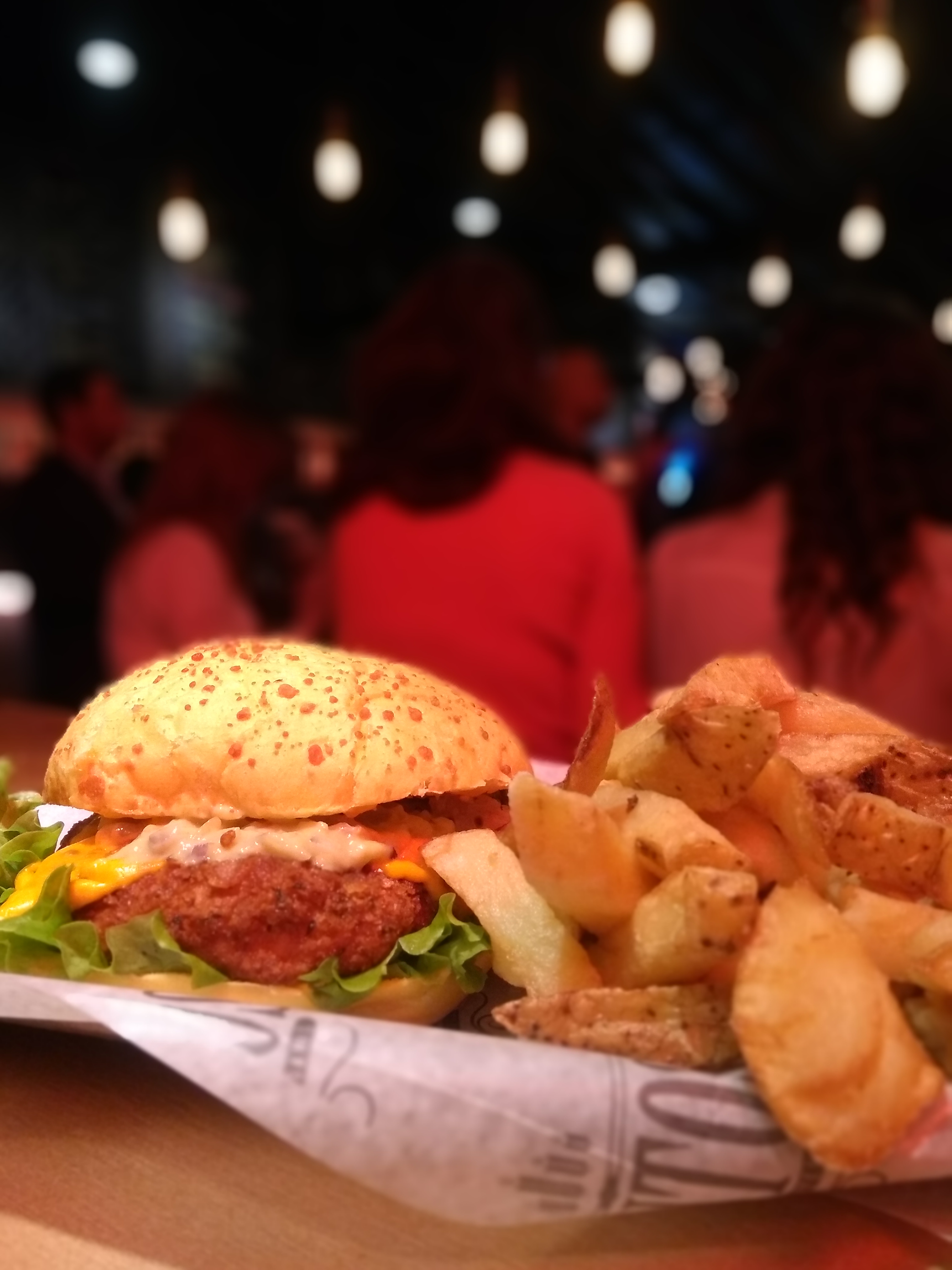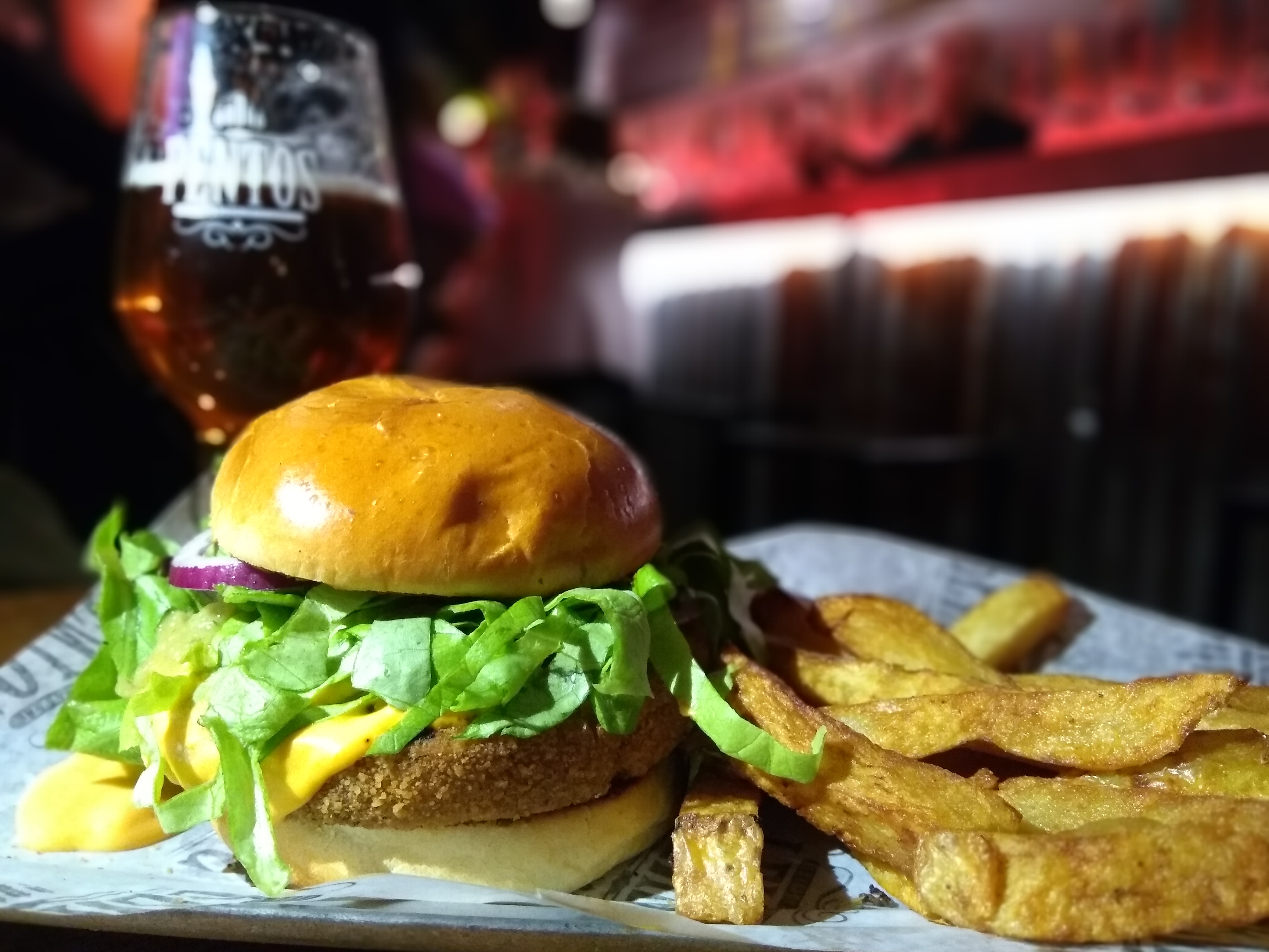 Seguimos con las burgers: pedimos una Hamburguesa Pentos ( La elegimos simple, así que salió con un medallón de carne con cheddar, panceta, rúcula, cebolla caramelizada y pepinillos. Sabrosa, con un blend de carne muy rico y gusto a parrilla. Los ingredientes se sienten todos, y van formando capas de sabores en tu boca! También sale doble o triple, vos elegís si querés quedarla en Pentos!), una Pollo Crispy ( sale con cheddar, guacamole y lechuga en pan con queso. Sabrosa, picantona, el medallón de pollo es enorme y súper rico! Nos sorprendió para bien, porque normalmente evitamos las burgers de pollo y esta nos enamoró!) y una Hamburguesa Veggie (hamburguesa de soja, con cheddar, rúcula, cebolla morada y tomates. La nuestra salió con lechuga porque había faltante de rúcula, y si bien es una burger que cumple y es rica, no entró dentro de nuestras cosas favoritas de Pentos). Tomamos una Demonia de Nuevo Origen (una Belgian Ale de color ambarina y aroma frutado, en boca se repiten la fruta junto a notas especiadas y de ciruelas/pasas. De peligrosa tomabilidad para los 7.5% de alcohol que acusa!) y una IPA de Cheverry (dorada, con notas cítricas y herbales, de amargor medio).