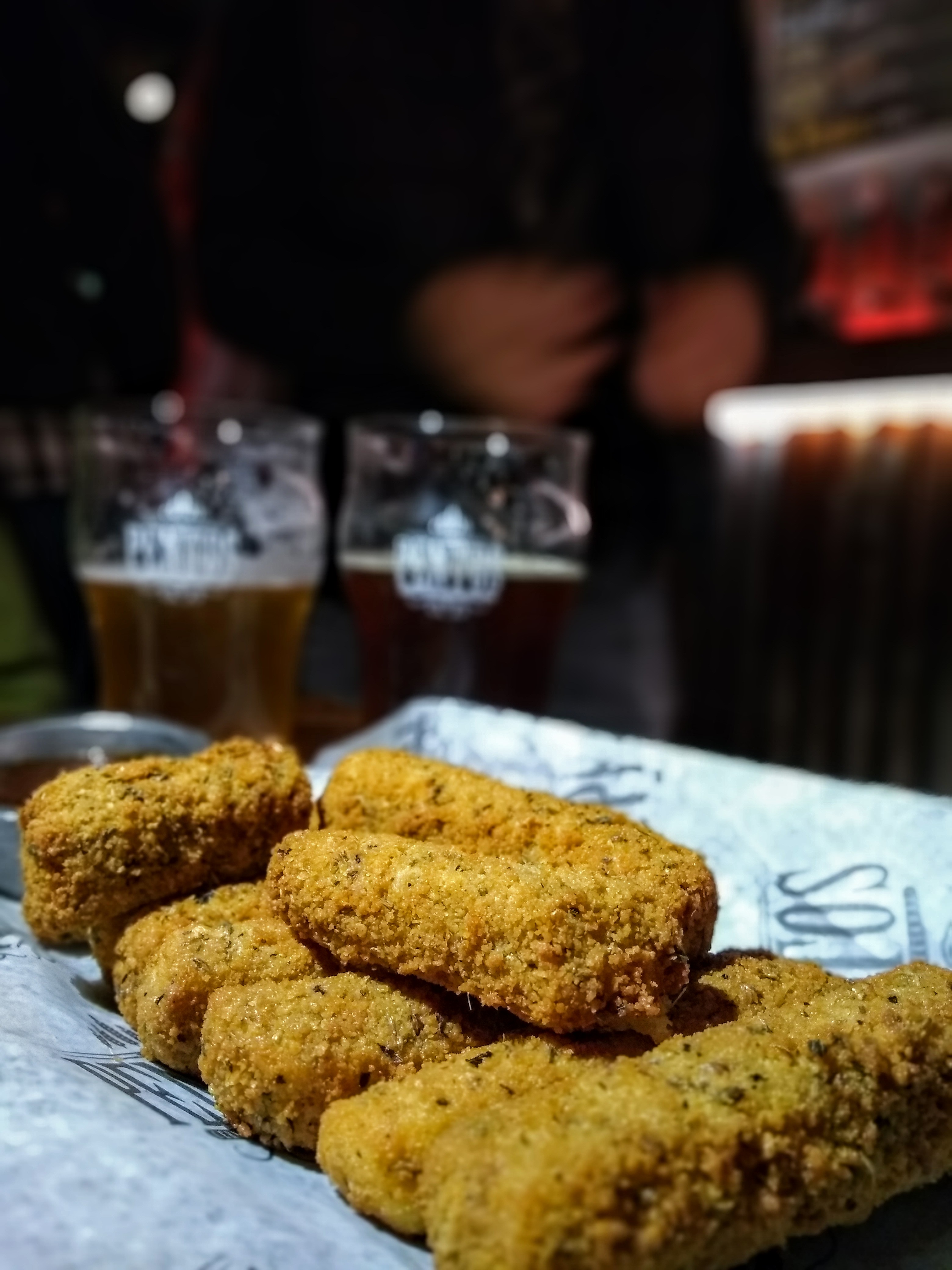 Arrancamos con unos Bastones de muzzarella, que son ideales para compartir! Vienen 8, así que si vas sol@, posiblemente esa sea tu cena si elegís los bastones! Crocantes por fuera, con rebozado con semillitas, y bien quesudos por dentro, como debe ser! Salen con salsa BBQ y nos gustaron mucho! Acompañamos con una Mozart IPA de Quiquia (ámbar, con marcado aroma a frutos tropicales que se repite en boca y da lugar a notas cítricas, de amargor medio. Una de las IPAs que amamos y tomamos donde la veamos en pizarra!) y una Dunkel Weizen de Ogham (rojiza, de espuma amarronada y aroma frutado, en boca notas a caramelo, algo de tostado y notas frutadas como en nariz).