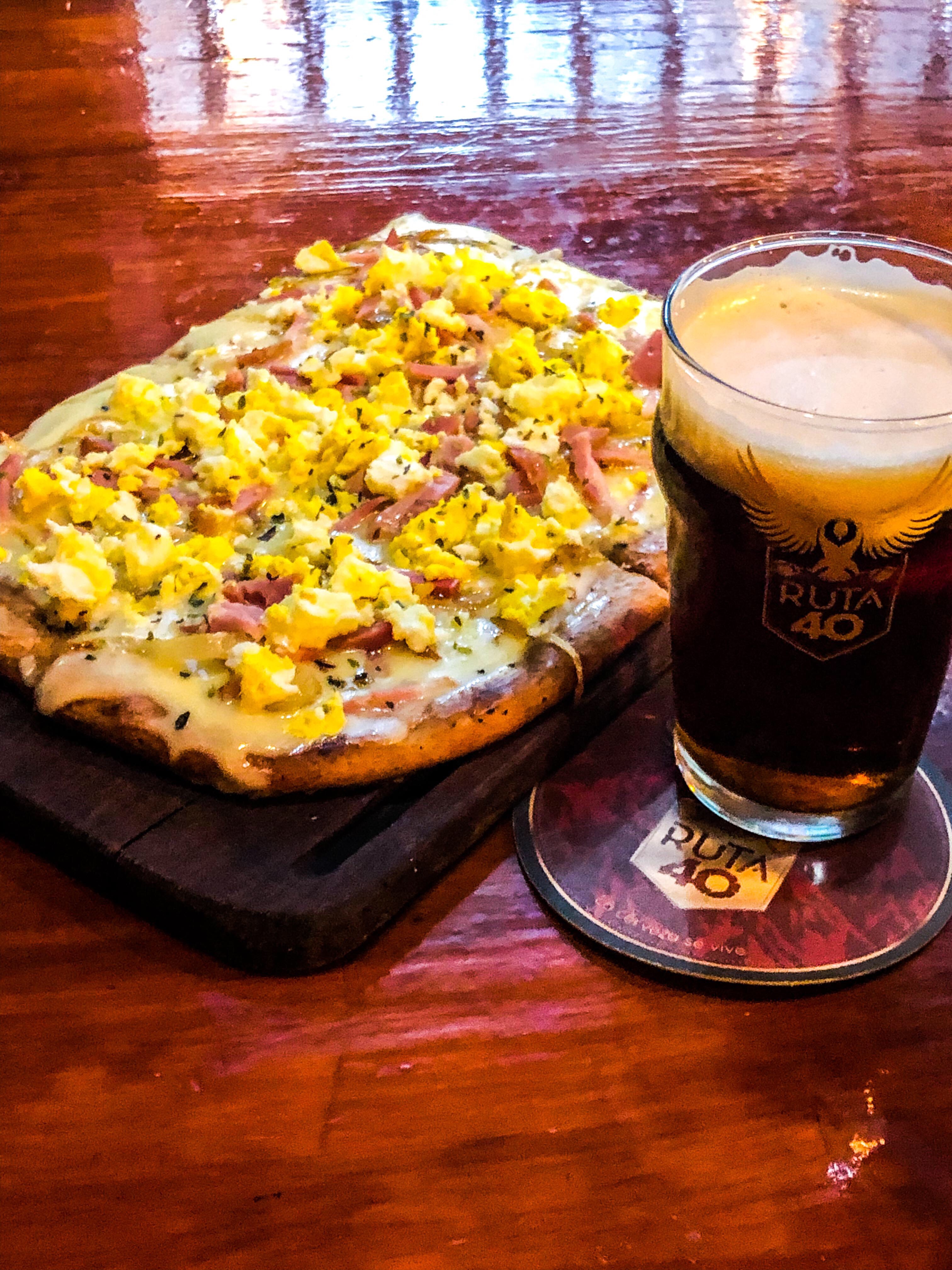 De plato principal y una de las especialidades de la casa, nos llegó a la mesa la pizza “Desafío Ruta 40”. Una pizza con muzarela, panceta ahumada fresca, cebolla caramelizada y huevo duro rallado arriba. La masa, como adelantaba renglones arriba, también está hecha con maltas caramelo. Cuestión que, entre la cebolla y la masa, el dulce predominaba en el plato realzando todos los sabores de la pizza. El bordecito de la masa (muy odiado y amado por todos), que era a la piedra, parecía un pan integral casero. Pensando en el dulzor del plato y la complejidad de la cebolla y la panceta, nos decidimos por pedir una Trippel de Deleuze y una Dubbel de Ruta 40, ambos estilos de la escuela belga de cerveza con perfil dulce y notas a frutos secos. La Dubel presentaba frutos rojos y un dulzor medio, estilo caramelo de flan, con una fina carbonatación y espuma persistente. La Trippel (IBU: 15 y 8% de alcohol) tenía un perfil dulce medio, con unas notas especiadas junto con una gran presencia de frutos rubios como el higo. Ambas cervezas maridaban bien, aunque la Trippel conseguía ese tercer sabor que un optimo maridaje busca. El primero es la cerveza, el segundo la comida y el tercero es el que potencia el todo y aumenta la experiencia. En este caso el maridaje bajaba los 8 puntos de alcohol de la cerveza, subiéndole el cuerpo y la cremosidad. La combinación de la masa de malta cervecera y la cebolla potenciaba el dulzor y el especiado de ambos disminuía. En ese mismo momento aparecía un gustito a caramelo inglés, parecido al Butter Toffee pero sin el “butter” que redondeaba todo el bocado y completaba el maridaje.