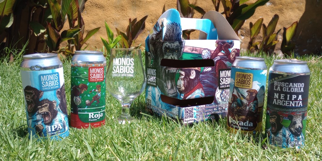 - Monos Sabios: la cervecería de Olavarría salió a la cancha con 2 propuestas mundialistas. Por un lado, un combo que incluye copa y 3 birras (IPA Argenta, Dorada pampeana y Roja pasión) en una caja ideal para regalar y regalarse. Por el otro, Buscando la Gloria, una NEIPA Argenta colaborativa con Jabalina con lúpulos Victoria, Patagonia Red y Patagonia Passion que dan como resultado una cerveza frutal, de perfil cítrico y sedosa. Podés pedirlas por Whatsapp.