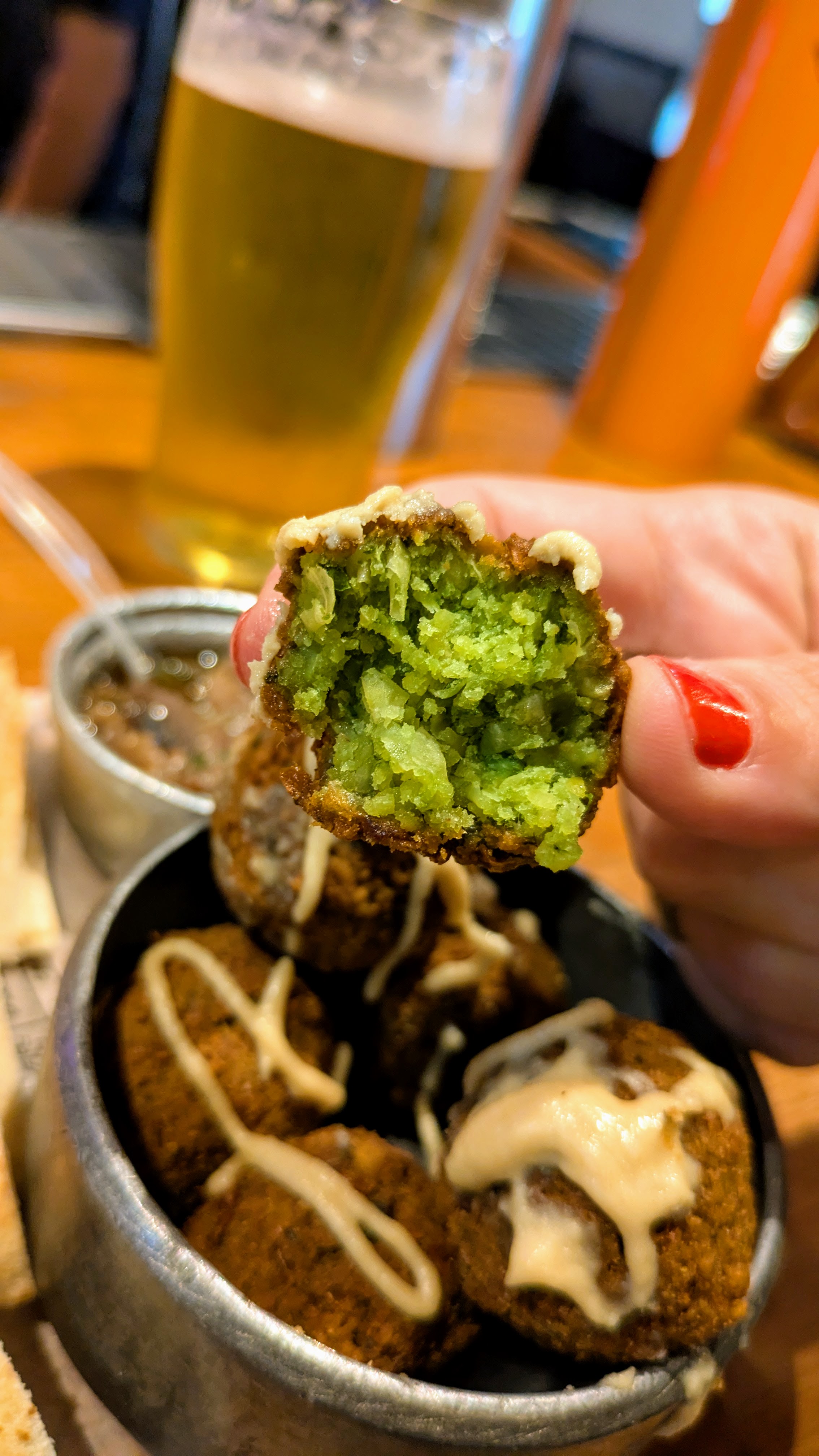 Seguimos con una Picada Falafel, que viene con pan pita, falafel, dip de hummus, berenjenas en escabeche y chucrut. Estaba riquísima! Nos pareció una gran opción, que además es súper original dentro de una cervecería. Completamos la picada con las clásicas empanadas de hongos fritas que son una locura y te recomendamos que no te pierdas!!! Acompañamos con una German Pils de Minga y una Session IPA Argenta colaborativa entre Desarmadero, Pekko y Federal.