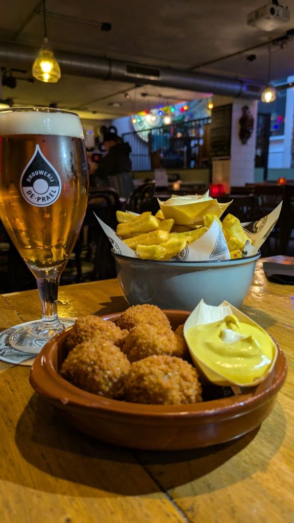 Con más de 20 canillas de birra que suelen rotar entre estilos clásicos, experimentales, colaboraciones e invitadas, cocina con platos holandeses clásicos y una vista bien local: gente cruzando los puentes, bicicletas por todos lados y ese aire húmedo tan típico de la ciudad.
